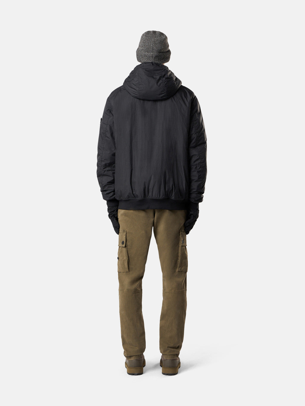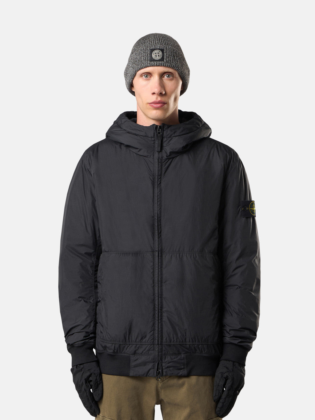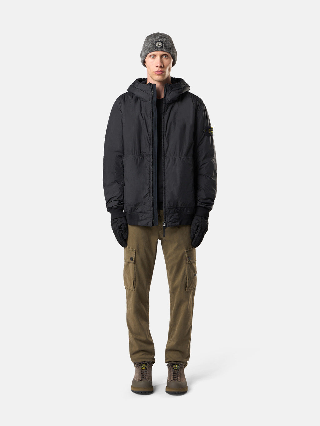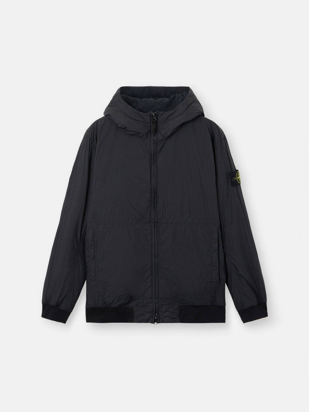 Padded jacket in a light recycled nylon rep with an ultra-tight weaving construction. The resin coating of its inner face makes it wind resistant and mildly water resistant. Due to the resin treating of the material, the colour penetrates unevenly into the material, lending a crinkled appearance to the surface. Padded with PrimaLoft -TC, an exclusive blend of high-performance insulating fibres, 70% recycled, engineered with Stone Island for garment dyeing. Garment dyed with the addition of a special anti-drop agent.